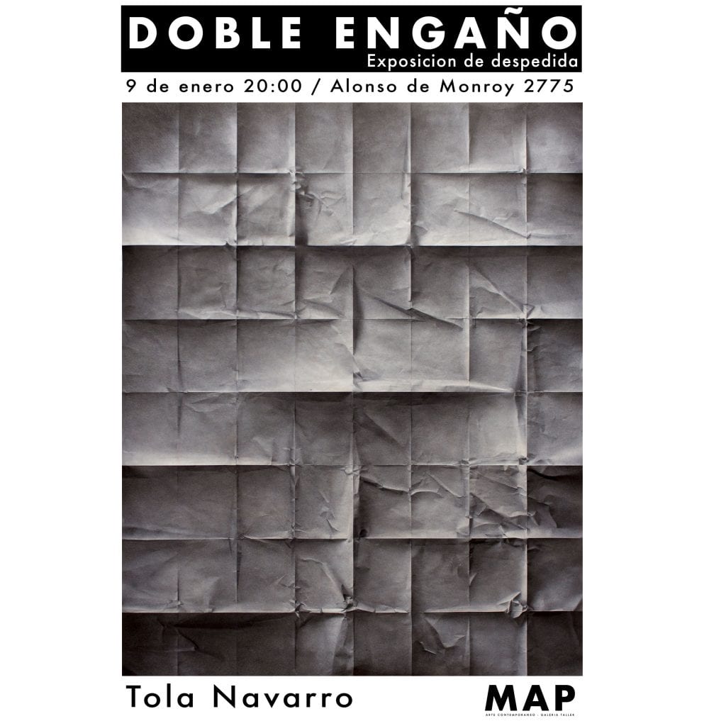 Doble Engaño es la segunda exposición Individual del artista Tola Navarro, en la que nos desafía a ver una doble realidad, representada en obras de papel de distintos formatos, con la técnica de dar forma a través de las arrugas, pintadas con spray creando un juego de luces y sombras.