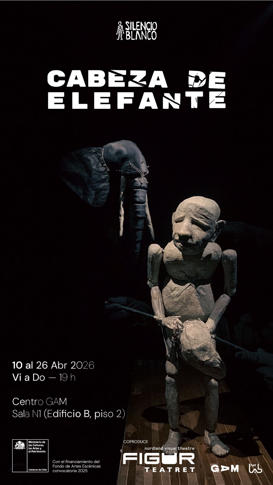 Cabeza de Elefante presentada por Silencio Blanco es una  Coproducción con Figurteatret (Nordland Visual Theatre), GAM y HetLab Hasselt (Bélgica), y es parte del Plan de Gestión de la Compañía Silencio Blanco 2025-2027- Compañías de Trayectoria-  Financiado por el Fondo Nacional de Fomento y Desarrollo de las Artes Escénicas, Convocatoria 2025, del Ministerio de las Culturas, las Artes y el Patrimonio.