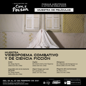 Desde este lunes 22 hasta el sábado 27 de febrero se encuentra disponible para ver gratuitamente a través de internet la muestra de películas del I Encuentro de cine y poesía: Poemas acéntricos o Actos de doble signo, co organizado entre Imagen y palabra, plataforma chilena dedicada al cine y la escritura y Corriente: Encuentro de Cine Latinoamericano de No Ficción que se desarrolla en Arequipa, Perú.