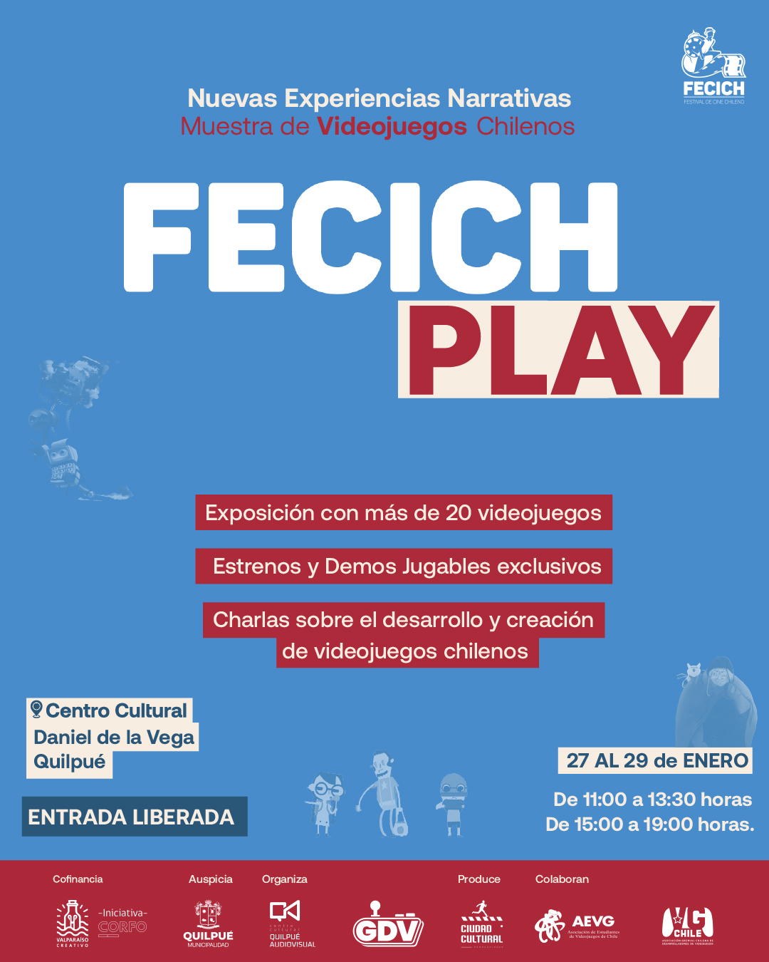 FECICH PLAY comenzó este martes 27 de enero a las 10:00 horas con la inauguración de la actividad y la conformación del gremio de videojuegos. Las actividades continúan hasta el jueves 29 con cuatro charlas sobre desarrollo y creación de videojuegos nacionales. La inscripción es gratuita y está disponible en www.fecich.cl
